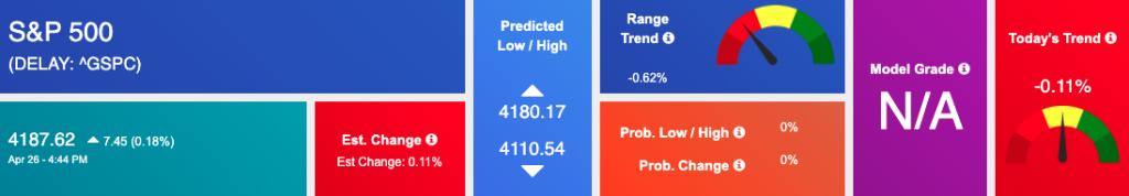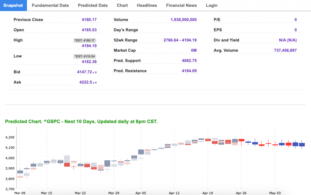 Using the “^GSPC” symbol to analyze the S&P 500 our 10-day prediction window shows a near-term mixed outlook. Prediction data uploaded after the market closes at 6 p.m. CST. Today’s data is based on market signals from the previous trading session.