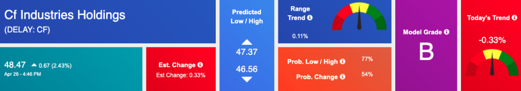 Our featured symbol for Tuesday is CF Industries Holdings (CF). CF is showing a steady vector in our Stock Forecast Toolbox’s 10-day forecast.