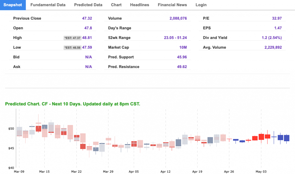 *Please note: At the time of publication Vlad Karpel does have a position in the featured symbol, CF. Our featured symbol is part of your free subscription service. Not included in any paid Tradespoon subscription service. Vlad Karpel only trades his money in paid subscription services. If you are a paid subscriber, please review your Premium Member Picks, ActiveTrader, or MonthlyTrader recommendations. If you are interested in receiving Vlad’s picks, please click here.