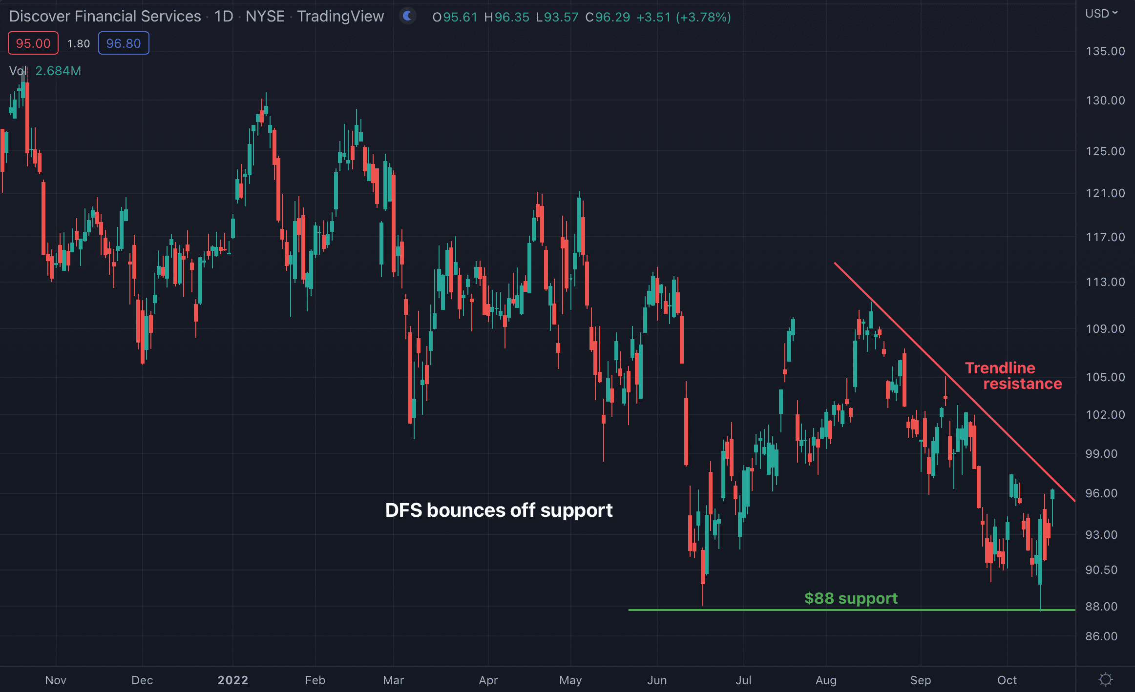 Take a look at the 1-year chart of Discover (DFS) below...