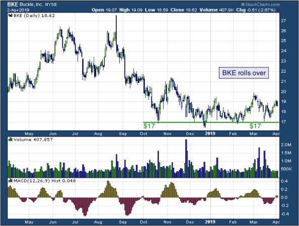 BKE has key support at $17. A trader could enter a long position at or around $17 with a stop placed under the level. If the stock were to break below the support, a short position could be entered instead.